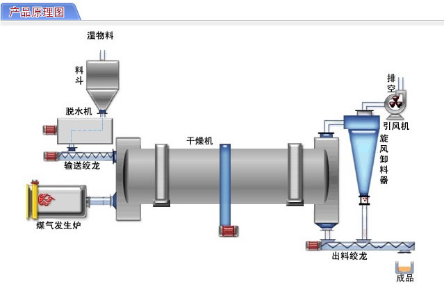 豆渣烘干機主要由供熱源、進料機、回轉滾筒、出料機、引風機、卸料器和配電柜構成;脫水后的濕豆渣進入烘干機后,在滾筒內均布的抄板翻動下,在烘干機內均勻分散與熱空氣充分接觸,加快了烘干傳熱﹑傳質。在烘干過程中,豆渣在帶有傾斜度的抄板和熱介質的作用下,至烘干機另一段星形卸料閥排出烘干成品。在方案設計當中、充分考慮到豆渣水分含量大、蛋白含量高、粘性大的特點,并采取了系列合理的技術和工藝來加以解決,以確保良好的烘干效果。